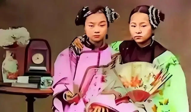 这张影楼台面的摆钟是个讲究玩意儿,黑漆木壳带金边,旁边一把大折扇压在桌角,两个姑娘脸上扑粉厚,眉心一点黛色,衣料色鲜却没笑意,那会儿照相是大事,得正襟危坐,心里怕把灵魂给照走了。