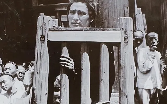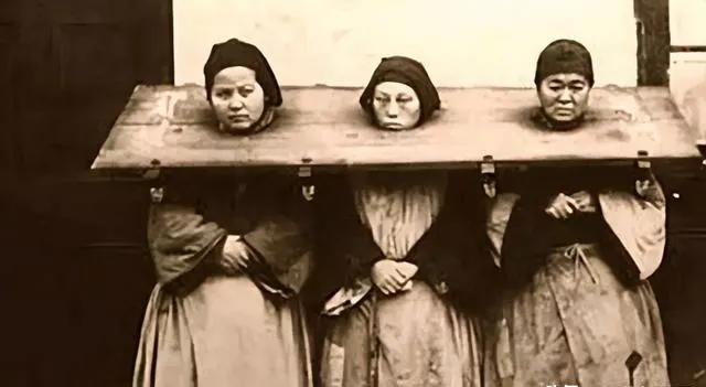 这个木板叫连枷,三孔穿颈,木面粗砍痕一条条,板沿油渍发黑,女囚被剪了辫梢,头发戳成一圈小茬,眼神木木的,衙役省了麻绳,一块板就把三个人的路走成了一条。