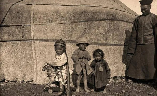 毡房前孩子手里拎的小东西是个铜铃架,细杆穿着两粒铃,走两步叮当响,旁边的娃脚背上绑着护脚布,草原的风大,鞋里总是进沙子,这点小心思是娘教的。