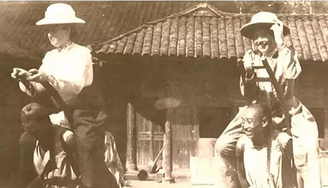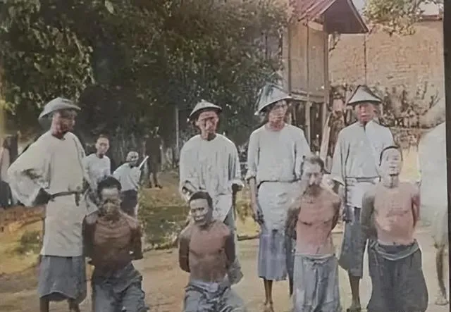 晚清老照片:女囚犯被剪短头发,外国女人骑着两个男人笑得很开心。