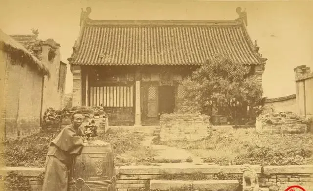 图中这一处院子原是寺庙,屋脊压得低低的,灰筒瓦密密一排,前檐立着木柱,地上砖台断断续续,坛缸旁边还倚着个少年,手搭在铜活口上,像是刚打完水的样子,奶奶说这缸叫“大肚皮”,夏天最凉,井水一灌能镇住一院子的热气,现在自来水哗啦开就来,那种从瓮口舀水的“咣当”声,再难听见了。