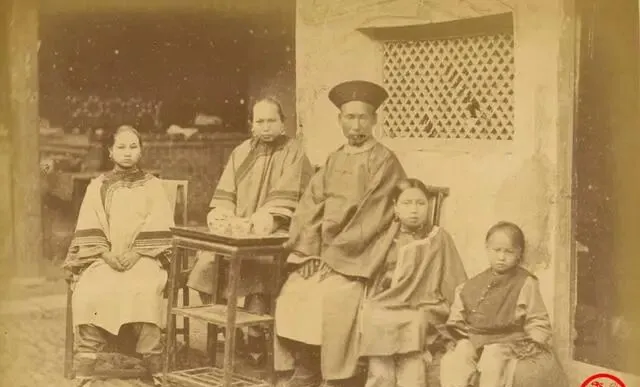 这个屋门口的摆拍挺讲究,图中椅子是圈椅,靠背弧着,桌上搁盖碗,男人戴着花翎帽,袍摆拖在膝上,孩子的小马蹄袖鼓鼓囊囊,妈妈看了笑,说这阵仗叫**“端坐留影”**,讲究正襟危坐不眨眼,以前照相是件大事,要挑好日子穿好衣,现在手机一抬咔咔两张,照片多到不想翻。