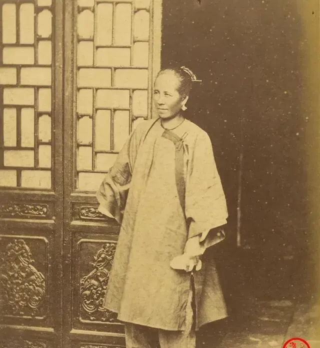 图中这位穿直身长衫,袖口落得宽,手里攥着帕子,门后是雕花格门,浮雕里有缠枝纹,耳坠垂下来一点点亮,妈妈说这叫**“清淡打扮”**,不夸张,靠料子和做工显分量,过去衣裳讲究“面儿里儿都过得去”,现在呢,标签比针脚还显眼。