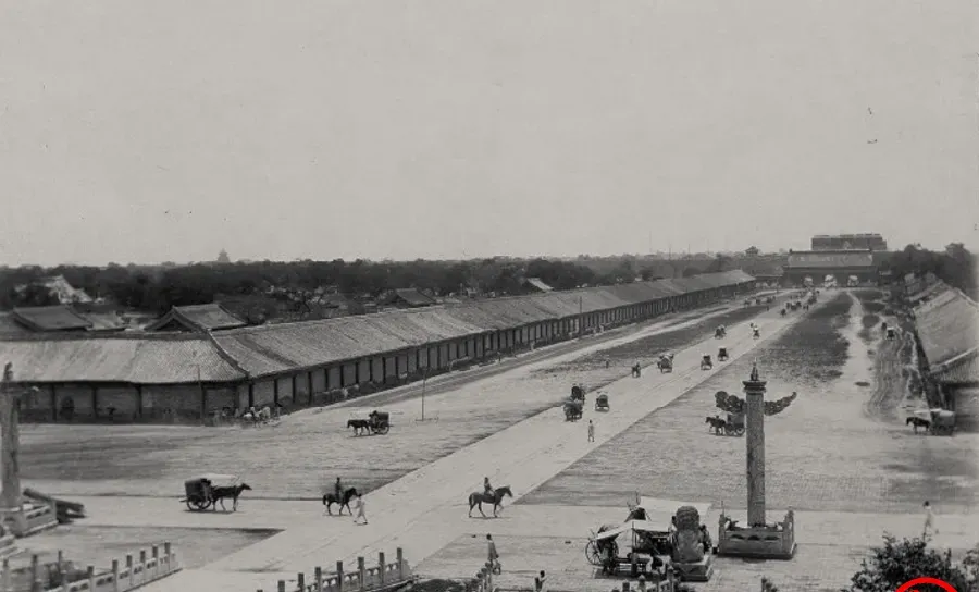 这排连檐通脊的廊屋叫千步廊,两边对称往前铺开,路当中辘轳车慢慢走,前头骑马的抻着缰,远处城门身子有点斜,镜头把空阔都装进去了,爷爷说六部衙门在这片儿办公,跑堂的小吏穿快靴,冬天石板路硬邦邦的,一脚下去“咯吱”响。