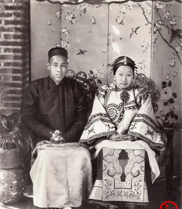 这对坐着的叫新婚夫妇,男的长衫挺括,女的披着团花大袖,纹样里有回字和蝙蝠,取个福气回环的彩头,屏风后面画着梅雀,砖墙边摆一盆阔叶草,像是特意搬来撑排面的,妈妈看了笑说,结婚那会儿都把压箱底的穿出来,折痕都来不及烫平,可也要体面。