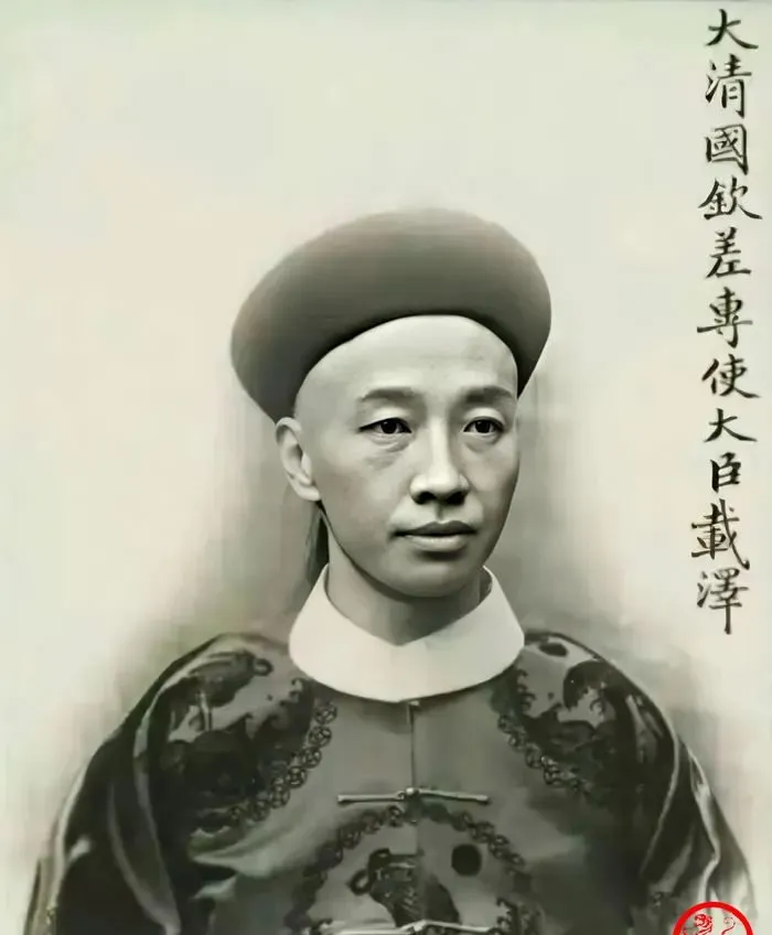 这位的冠帽圆润,面上清削,叫加贝子衔镇国公载泽,背景擦得干净,留白处竖着几行字,笔锋挑着劲,像给人压了个框,照片里的人年轻,眼睛却不算亮,像熬过几宿的样子。