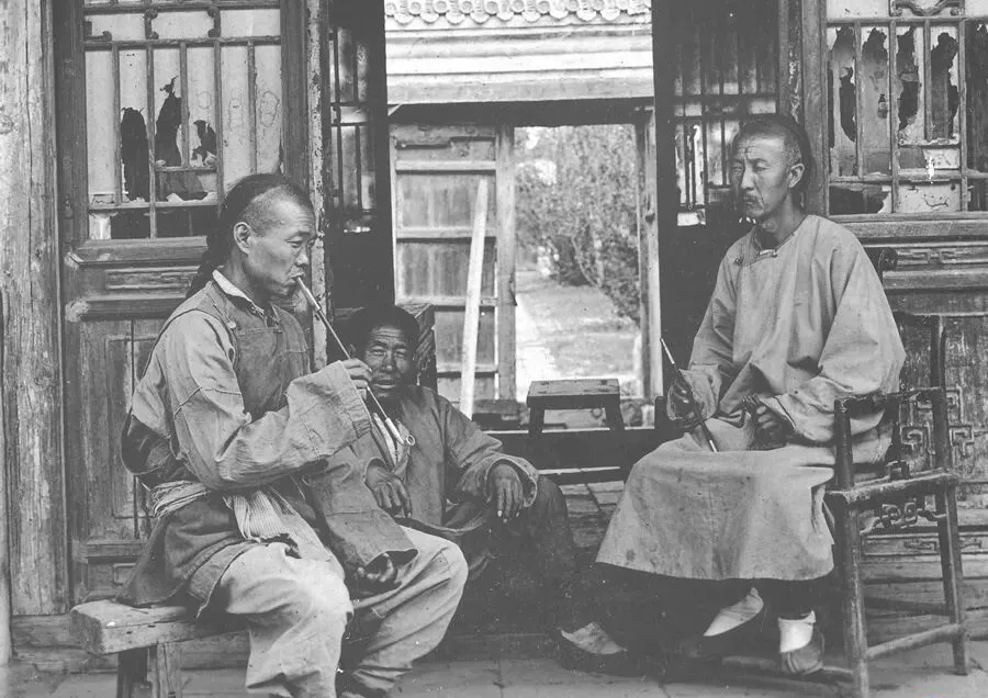 这几位的家伙叫烟杆,一长一短夹在指间,门后破窗纸卷成毛边,桌上落灰,几个人架着腿慢慢抽,吐出的烟横着飘,日子再紧,也要留一阵子给聊天,过去这样过一个午后,现在一根外卖电话就把时辰打碎了。