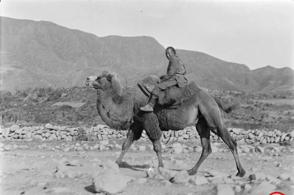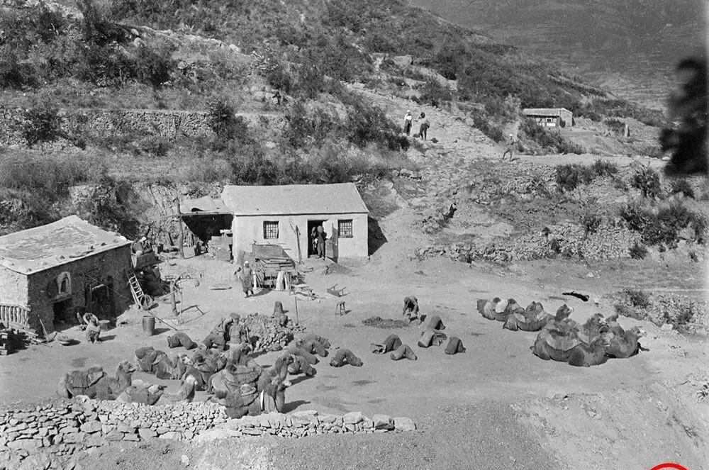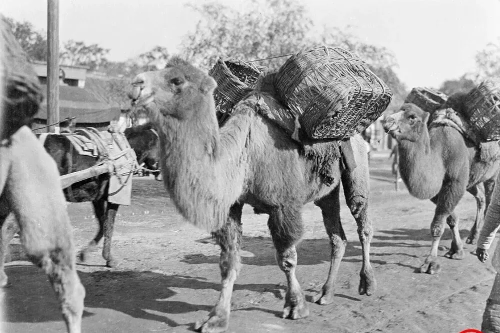 图上这些编得紧的柳条筐叫“驼筐”,一左一右挂在鞍帮上,里头装青菜煤球什么都行,走起来筐沿子哒哒碰鞍,驼脖子一仰一合,嘴里嚼着反刍的草团子,别看慢,半天能顶小车来回两趟。