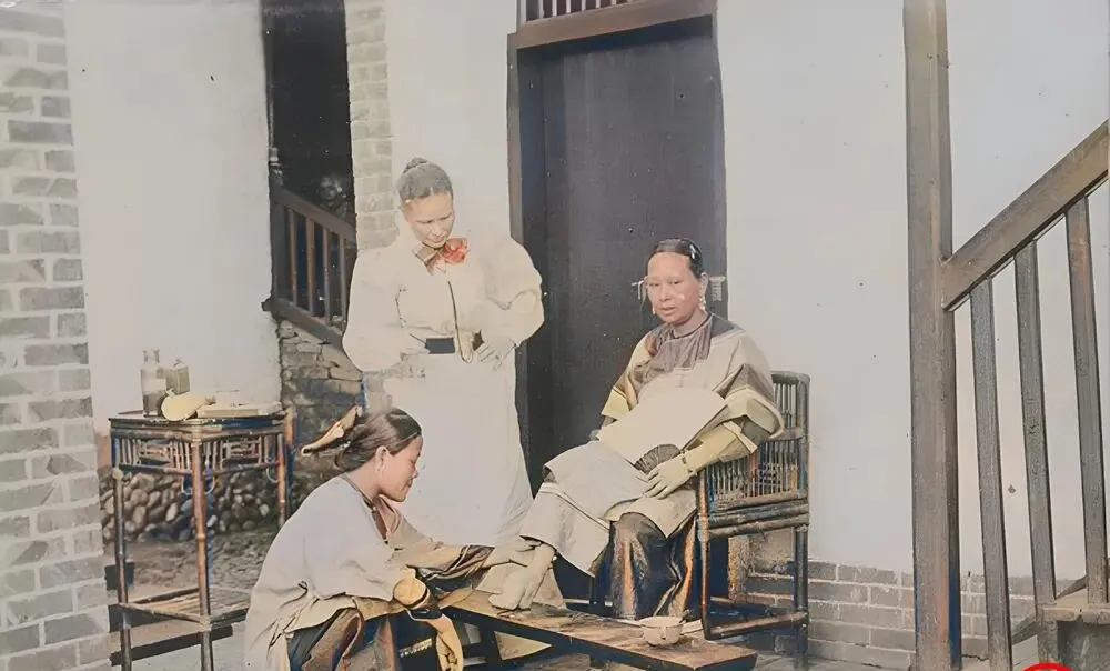 图中木凳前这双小鞋叫三寸金莲,细看是尖头绣花鞋,鞋面缎子光泽还在,颜色淡得像被岁月洗过一遍,裹脚布层层缠紧,脚背鼓起一小坨,走起路来得一点点挪,旁边那位洋人站着瞪眼看稀罕,奶奶说当年有的婆婆会拿细棍子敲脚背让更紧一点,疼得要命也不准叫唤,现在看着心里发拧,过去把这当礼教,现在我们把舒坦当福气。