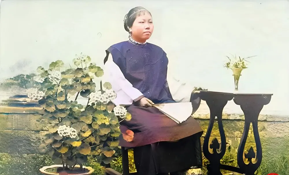 这个坐在花盆边的女士拿着的是折扇,扇骨细长,扇面白净,上身罩一件深蓝棉褂,脚下是正常的天足,坐姿宽松不拘束,眼神淡淡的,像刚从屋里出来透口气,那会儿要见天足不多见,外婆见着照片还笑,说她娘年轻时就不让缠,挨了不少闲言碎语,可是脚板踏实,干起活来也利索。