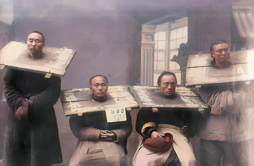 这几块方方的木板叫枷,扣在脖颈处,板面粗糙裂口清楚,有的人在板上还挂了纸牌,上头写着名目和数字,听说照片里不是真犯人,是被叫来做样子的,可就算是摆拍也能看出难受,脖子动不得,吃喝睡都麻烦,最难过的是站在街口被看热闹的盯着,脸上那点自尊心啊,一点点被耗掉。