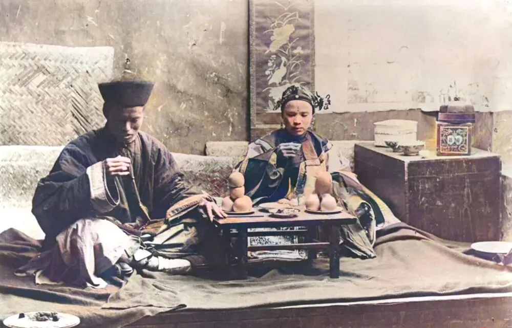 晚清彩色老照片:新郎新娘入洞房喝交杯酒,男人织布有模有样。