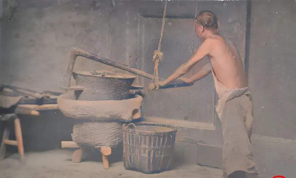 这个靠绳子吊着的横杆是磨盘的省力结构,重力让杆子往下走,人手扶着往前推就省了不少气力,磨槽里沙沙作响,粉末顺着口袋往下倒,汗水从后背一线线地往下淌,停住的一刻头都晕着打转,舅舅干过这活,说最怕的是天闷,石磨发黏,得往里洒点谷糠,磨才走得顺。