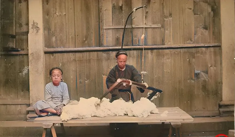 图中这套木头架子就是织机,杼盒在手里来回穿,脚下踩踏起落有节拍,年轻人低头盯着经线,一副有模有样的劲头,爷爷说那阵子男人上机少见,家里要赶活或者缺人手就都上,梭子一抛像一条灰影窜过去,织一匹布得坐到腿麻,现在打开手机下单两天到家,以前一身衣裳得从一捻一织攒出来。