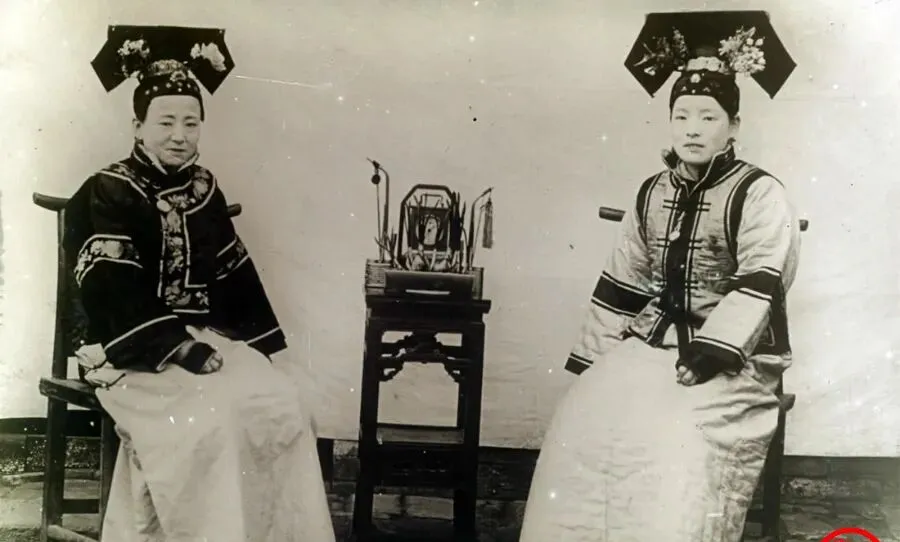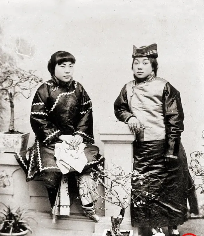 这个画面里左边的穿袄裤留整齐刘海,脚裹得小小的,叫三寸金莲,手上拢着帕子一副要拍照的小拘谨,右边这位倒是利落,男装长袍套身,脚登旗鞋,帽子一压,透着几分英气,外婆看了笑,说那时候就有敢穿敢试的姑娘,现在一件衣服千种穿法不稀罕,以前换一身款式都要被街坊打量半天。