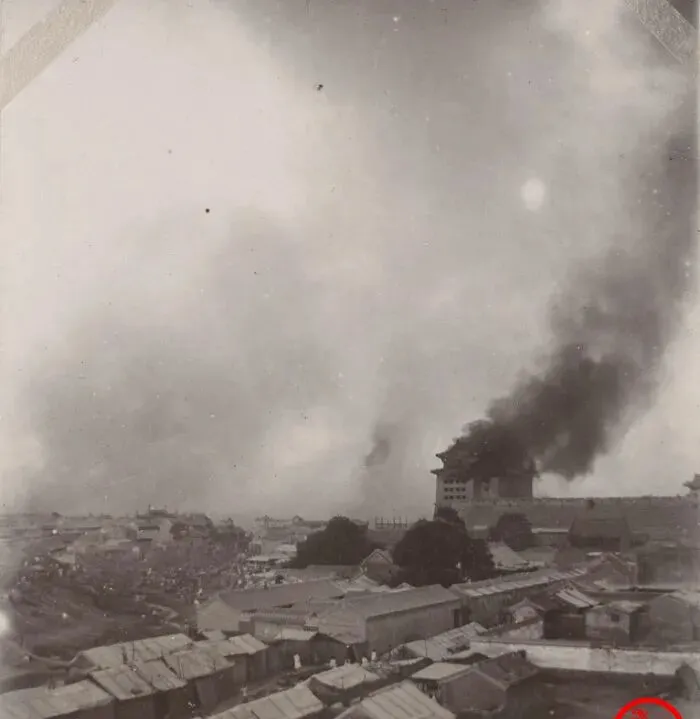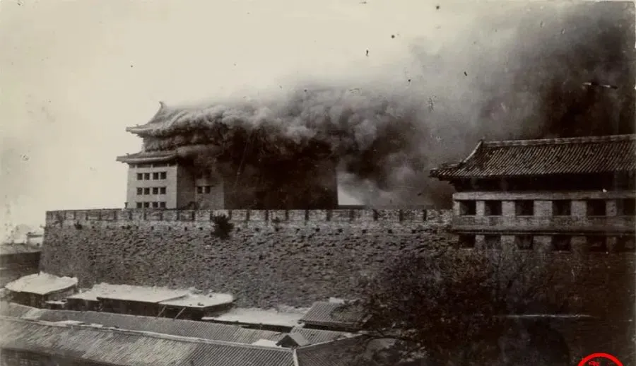 图中这团翻滚的黑烟,是箭楼起火,屋脊上火苗一撮撮往上窜,风一扇就把烟拉成了长龙,远处屋顶都是灰白的,像被烟尘轻轻按了一手,那年有水会的人提着皮囊跑,喊声盖过市井的喧哗,可水泼到楼檐又被火光吞掉,真是干看着心里发紧。
