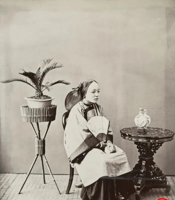 这位端坐的小娘子,发式叫帆船髻,脑后拢得光亮,发髻朝后起势像一张小帆,耳边簪一枝银花,手里捏着团扇,桌上摆一对粉彩扁壶,边角敲得圆,案几是洋气的雕花三足,妈妈看见就夸一句,东西放得讲究,人也就显得体面,以前照相可稀罕,得挑好日头换好衣裳才进影棚。