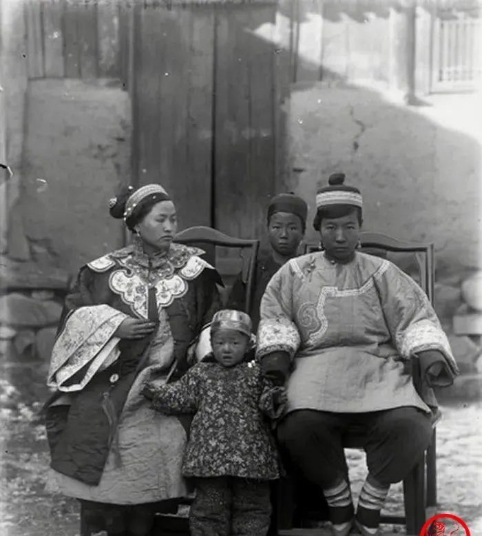图中这一家子叫典型的晚清合影,男人穿团龙纹样的袍褂,袖口肥大,女人披滚边比甲,胸前绣片一层叠一层,小孩头上戴着银片护额,鞋尖微翘,站在中间可认真了,别看穿得体面,背景一堵泥墙配木门,家底就在这明暗对比里现了形,拍照是件稀罕事,得把最好的一身穿出来,坐姿要正,神情要稳,像过年上香那样郑重。