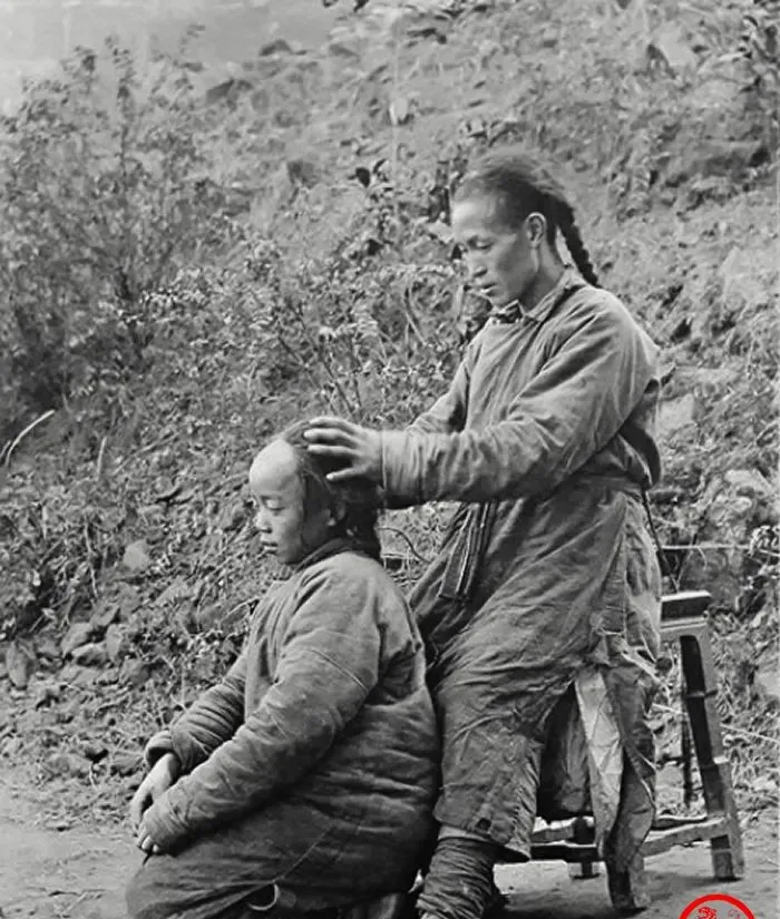这个门洞叫月亮门,两个少年挨着站,长衫遮到小腿,脚下布鞋露出白帮,脑后各垂一根辫子,眼神躲不开镜头的好奇,小时候我奶奶指着旧照说,梳辫子麻烦得很,起早抿水抹辫油,编紧了才算利落,现在理发店三分钟解决,想想真是两头的世界。
