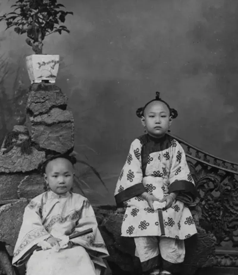 图里这两位叫小格格的装束,前额剃得锃亮,后面留着发辫,衣服上团螭回纹一圈一圈盘着,扇子握在手心里不乱动,这种发式是腾地方,等到年纪一到才慢慢蓄起来,别看规矩多,孩子的眼神却直得很,镜头一怔就把童年定住了。