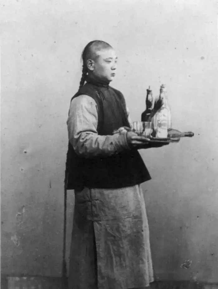 图中这只圆盘就是托盘,铜边包口,盘里摆着玻璃杯和洋酒瓶,细脚的杯子往往先擦再上,手指按在盘底的凹位稳住重心,他的辫子很长,垂到膝后再一路滑到脚跟,走路要侧一点,免得被跟跟踩住,这活讲究眼力见,客人一抬手就得补上酒水。