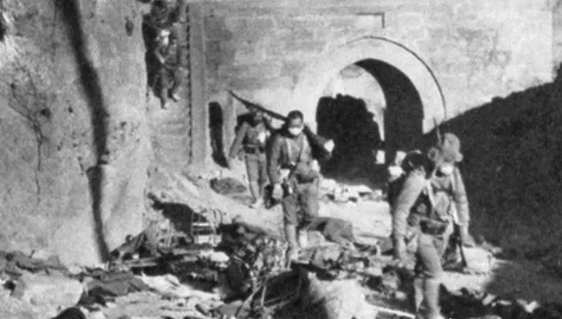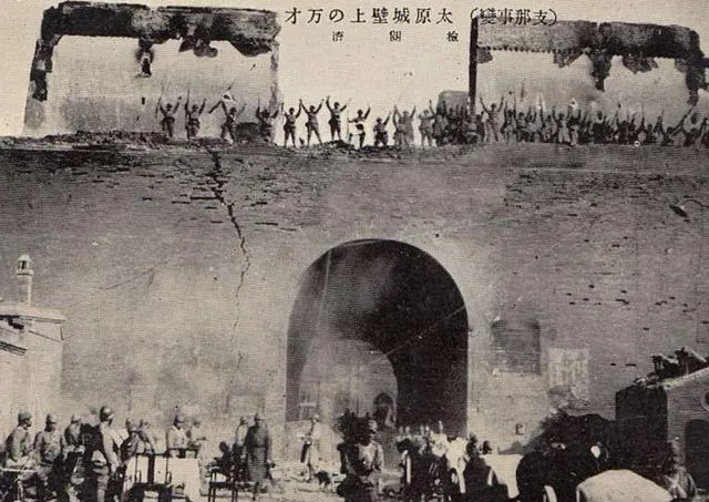 图中高大的城门就叫太原城门,砖体厚重,拱券深深嵌进去,顶部却被炮火撕开了口子,城头人影晃动,像在风口喊话,城下是驮马、脚踏、散兵,灰尘漫起来呛得人直咳,奶奶说,当年从这洞口进出,鞋底都带着灰,回到家先得在门外拍一拍裤腿,不然炕上一片土,照片里写着**“一致防共,尊崇礼教”**的墙面,和地上的枪影挤在一块儿,讽刺味儿重得很。