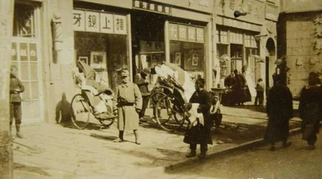 这条窄巷两边全挂着旗,风一拨啦啦作响,人力车把手靠在墙上歇凉,掌柜站在门口手插腰,写着“楼上镶牙”的招牌就那么直白,走过的人都瞄一眼,心里明镜似的,以前这条街天一亮就热闹,现在你看,影子长,脚步轻,像谁都不敢出声。