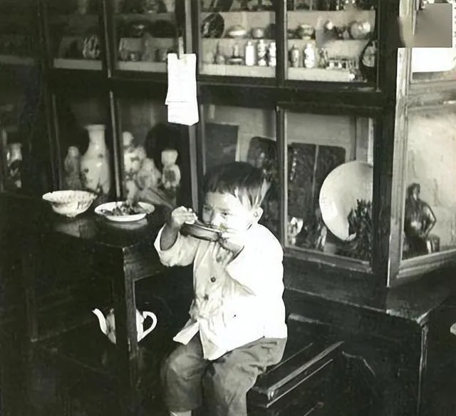 图中小家伙正端着碗吧唧吧唧吃着,身后玻璃柜里摆满了小玩意儿,瓷片、铜饰、木雕,样样都闪着旧亮,勺子磕在碗沿上叮当一下,我一听就想到自家旧搪瓷碗的声音,清脆又碎不掉的那种结实。