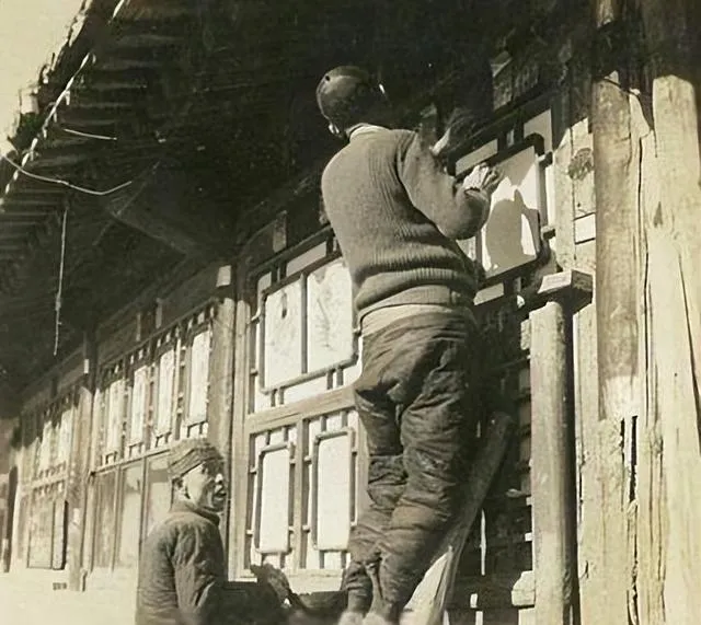 这个动作熟,刷子一抹,浆糊冒着黏亮,年画一铺平,用手背从中间往外抹开,边角不翘才算服帖,站在地上的人仰脸递着浆糊桶,笑得见牙,过年就图个喜庆,哪怕门外风声紧,也要把屋里收拾得热闹点。