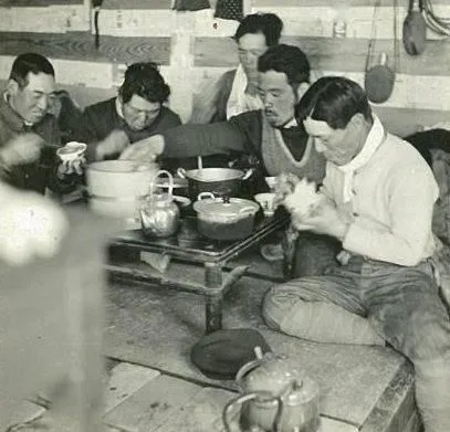 图中这些人正抱着白瓷碗喝粥,碗里稀得很,衣被堆成一团当靠背,表情说不上来,饿不饿自己知道,奶奶说,那会儿咬一口窝头都香,现在家里米面油齐活,反倒不觉得粮食有味了。