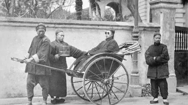这张场面叫黄包车出行,车上小伙戴着墨镜,一副我最时髦的劲儿,前头的车夫瘦硬,裤脚挽得高,脚下草鞋磨得发亮,旁边随从提鸟笼护伞,爷爷说以前有钱人出门讲排场,讲到细处就是有人拉、有人跟、有人侍候,热闹是他们的,汗水却是车夫的。