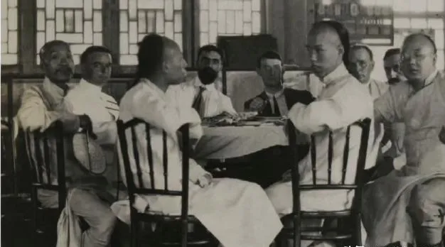 这个场面叫与洋人同桌,方桌转角窝着茶盏,窗格子是几何分割的冰裂纹,坐的人都偏着身子看镜头,手里还攥着筷子,气氛不算轻松,像在应付一顿面子饭。