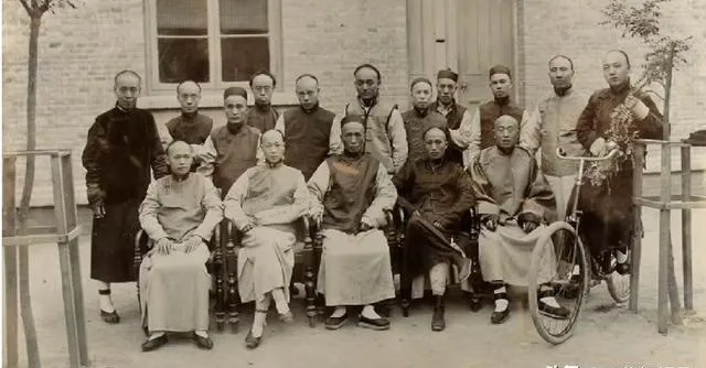 这张群像里长衫马褂整整齐齐,腿边还倚着一辆自行车,说明新旧混搭早就开始了,小时候听外公说,谁家若能照一张集体相,得先去借最体面的椅子,站位也有讲究,胖的坐里头,瘦的靠边站。