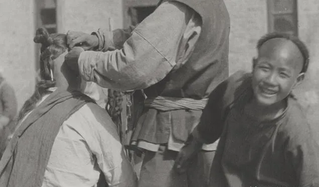 这个场景叫剃头挑子,一只手按住辫根,一只手刮前额,剃头匠腰里挂着刀套,笑嘻嘻的小孩探头进镜头,脸蛋油光发亮,咱那会儿也在街边剃过,风一吹脖颈发凉,抖两下就精神了。