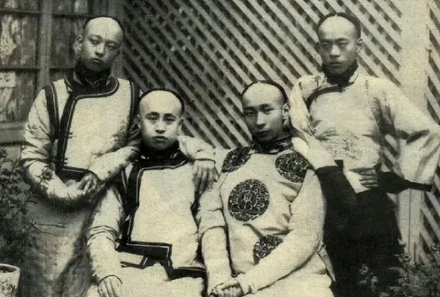 这里四个年轻人并排坐,衣料是亮面缎,领口圆圆的,两个还手拉着手,不是作秀,老规矩里这是交情好,拍照怯生,握住彼此就不乱动。
