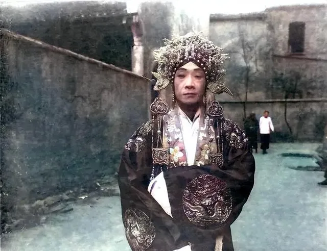 这个穿蟒袍的叫王府坐照,胸前团龙一圈一圈,手搭在扶手上,神情疲倦,院里石盆栽的菊花挺直,风一过叶子抖两下,老照片常有这种反差,花鲜,人却倦。
