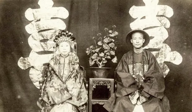 这张喜堂照背后贴着大大的囍字,桌上摆的盆景有点歪,说明忙活得急,新郎年轻清瘦,新娘肩膀被礼服压得直发抖,镜头按下那刻,人生的担子就落到架上了。