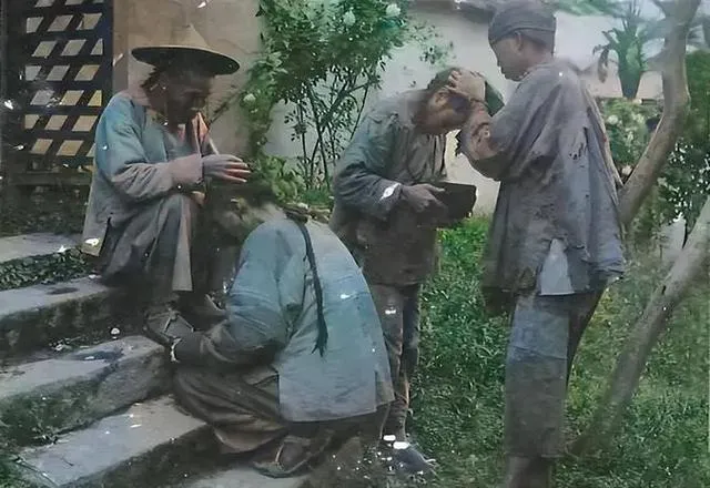 几个人坐台阶边,一个人低着头,另一个人翻着后脖颈的头发,袖口起了毛边,脚背灰扑扑的,那会儿自来水稀罕,洗不干净就互相抓,日子苦,也得把身上梳理清爽点。