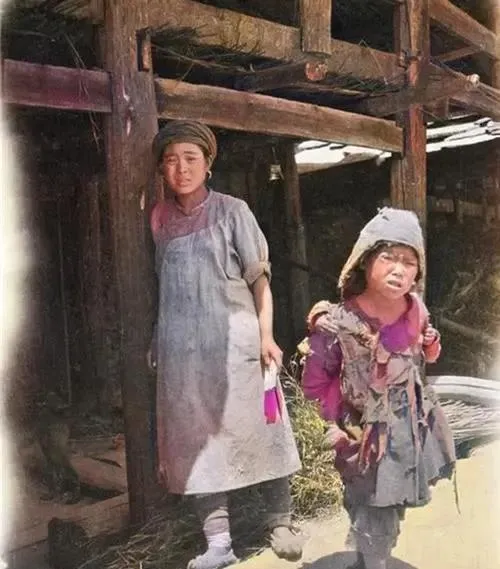 屋檐下的木梁粗糙得很,孩子的帽子歪在一边,衣服补了又补,嘴里还叼着一截草,眼睛却亮,穷,也挡不住孩子的好奇心。