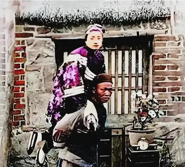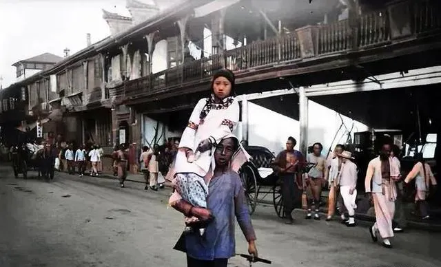 这几张都是龟奴肩挑女子的场面,窄街宽街都有,坐在上面的女孩脚不沾地,手里攥着帕子,肩上的人汗顺着脖颈往里灌,老规矩讲究男女有别,于是就有了这种看着别扭的出行法。