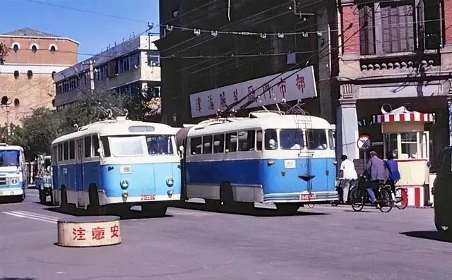 这对蓝白车身是无轨电车,车顶两根杆子勾在电线上,一拐弯还“吱”地弹一下,司机手稳,起步轻轻一给电,车厢里“哒哒”门把晃,孩子贴窗数站名,现在城市巴士多了电也静了,那股子嗡嗡声却再听不见。
