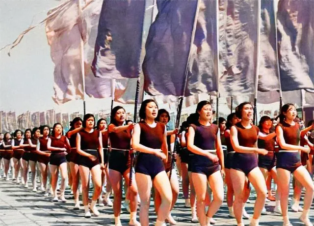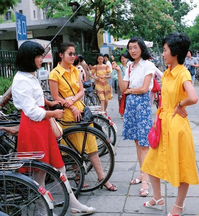 这张好看,姑娘们穿着碎花裙和黄衬裙,脚下是白凉鞋,手一搭车把,聊谁家的新电影票,风一吹,裙摆起褶,笑声在胡同里拐来拐去。