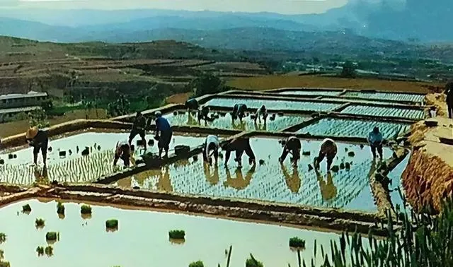 这活一看就知道是插秧,脚下泥里“扑哧”一声,手里一把秧苗抖一抖,按寸栽下去,奶奶说以前要讲行距,现在有机器,图快,可那条条水纹里的人影,真耐看。