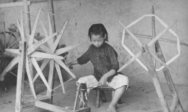 这工具叫挽线架,木条拼成八角,线在轴上“吱呀”转,小姑娘左手牵右手绕,线一根根收紧,等大人背去城里卖,能换回布票和盐。