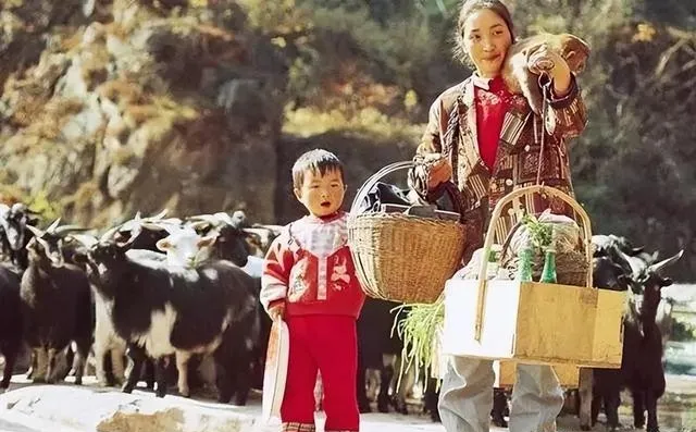 这张温柔,女人一手提木篮一手托背篓,旁边小男孩跟着羊群走,蹄声碎碎的,山风一过,草籽打在裤腿上,日子慢,可不穷。