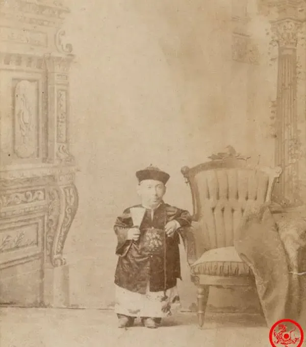 图中的这位个子不高却站得很挺,这个叫车玛,人靠在高背椅边,衣襟压得服帖,圆帽小檐,胸前一块补子亮起来,背后是洋味儿十足的雕花背景,舞台感很强,他那句“男人不是靠身高赢得尊敬,而是靠智慧和知识”传得很广,当时戏班子里就爱这种有故事的人设,现在看仍觉有劲道。