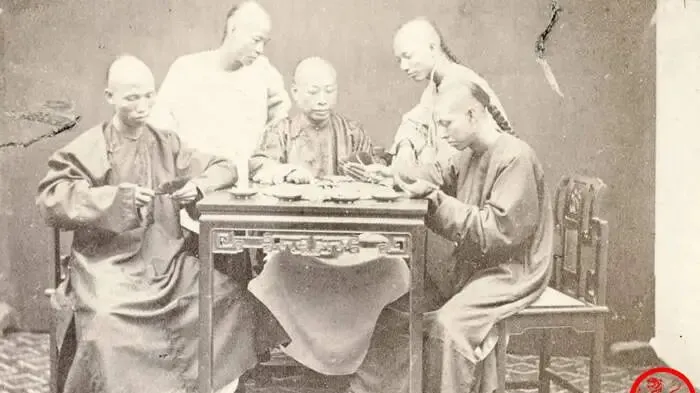 这个桌上不是现在的扑克,叫马吊牌,牌面长条细窄,握在手里叠成扇形,几个人围桌,袖口一拢一摊,眼神都落在牌上,有人抿嘴有人挑眉,赌不赌不好说,气氛是拢起来了,爸说旧时玩马吊讲个记牌与抖胆,现在换成了手机里的斗地主,热闹还在,牌味淡了。
