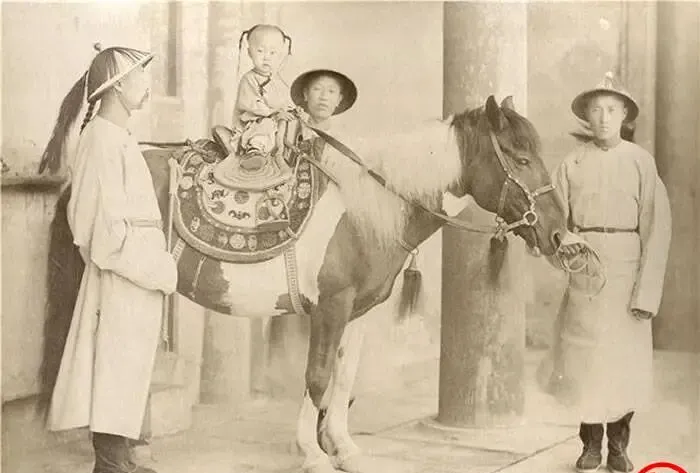 这个骑在马背上的小家伙戴着小帽,鞍具缀流苏,绣团花,左右跟着的是看护的差役,马嘴衔环,站得老实,常被误当谁谁谁的幼年像,其实大多是权贵人家留念照,师傅会先把马牵稳,再抱孩子上去,镜头一开合,孩子还来不及乱动,就被收住了一个乖巧神态。