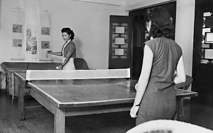 图里这张长桌当球台用,白布条拉一道当网,两边的女生脚后跟点地,手腕一抖球就过去了,乒乓在学校里可受欢迎,打到兴头上会喊一声球别出界,笑到扶着门框喘气,那时候的快乐很省事,一张桌子就够。
