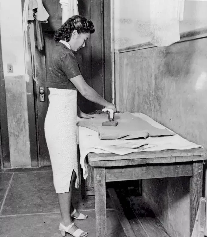这个小铁家伙叫熨斗,木柄短短的,手一握就稳,女生把裙子平铺在粗布上,顺着纹理从腰线抹到摆角,啪的一声按下去,布料立刻服帖,奶奶说旗袍最怕起皱,出门前领口要顺一遍,袖窝要抿一遍,走起路来才利落体面。